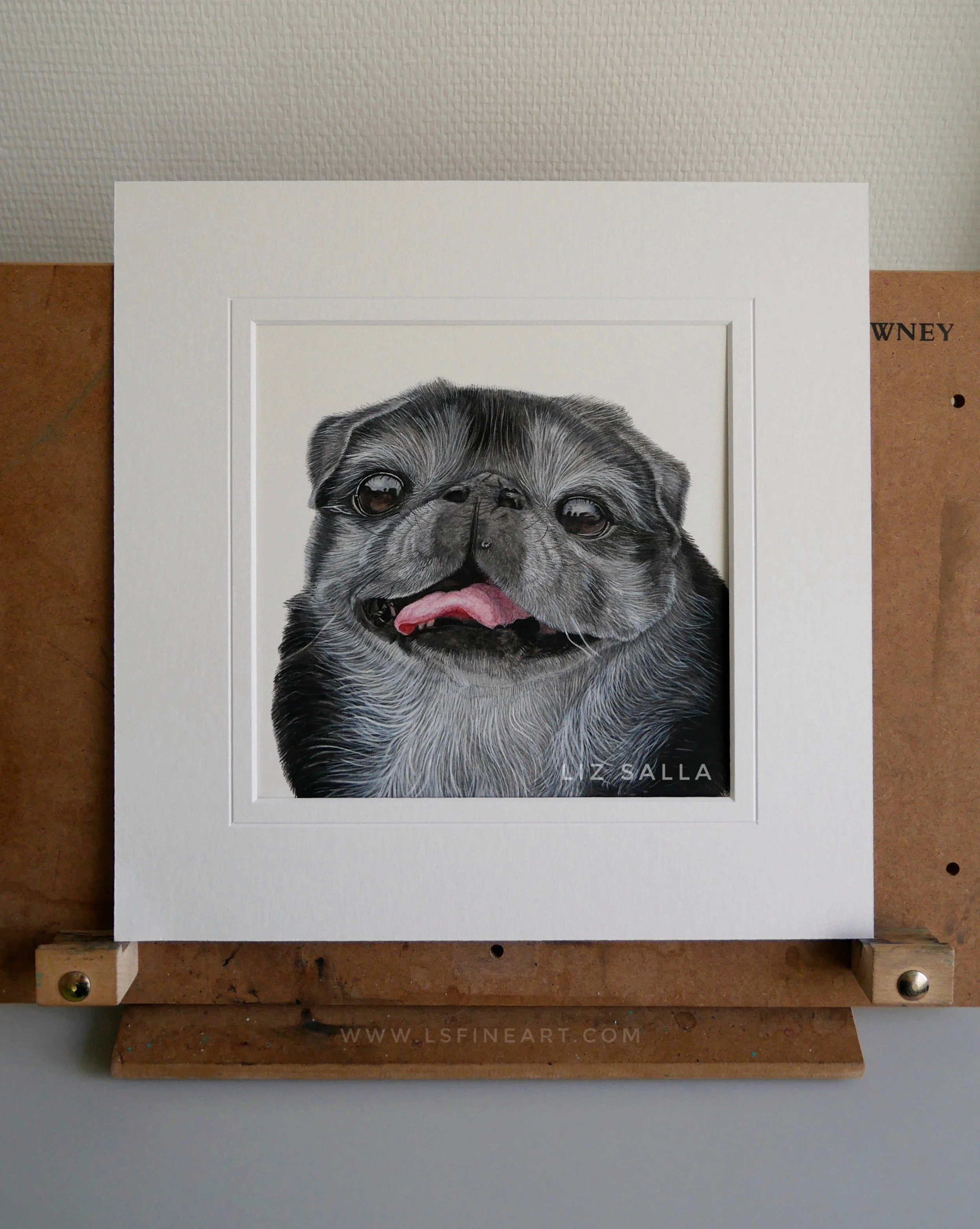 Once you’re happy with your commissioned pet portrait, you will receive an invoice that reflects the remaining payment and shipping fees. After receiving the final payment, the artwork will be placed in a polypropylene bag with its signed Certificate of Authenticity, and shipped flat with a layer of bubble wrap for extra protection.